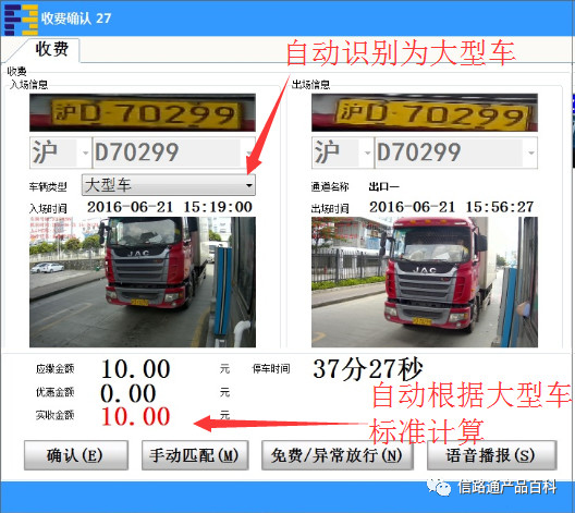 當臨時車輛出場時,讀取此車入場信息,自動對停車時長、車輛長度等計費;無須人工選擇車輛類型,